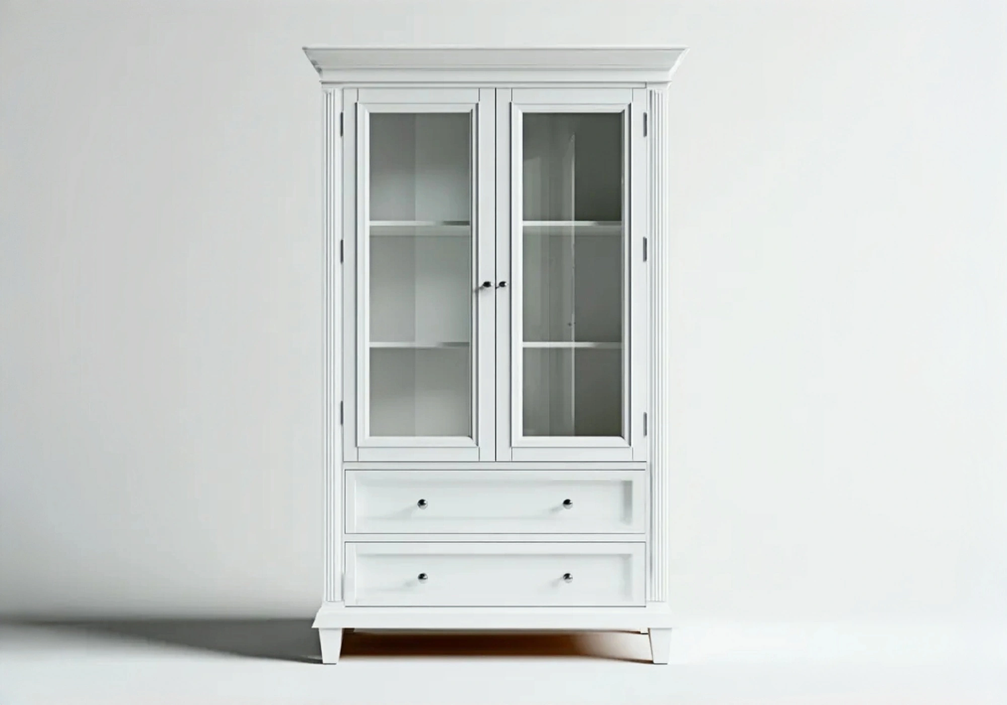 Estructura fabricada en madera con acabado blanco uniforme. Tiradores metálicos de líneas limpias que aportan un toque contemporáneo.